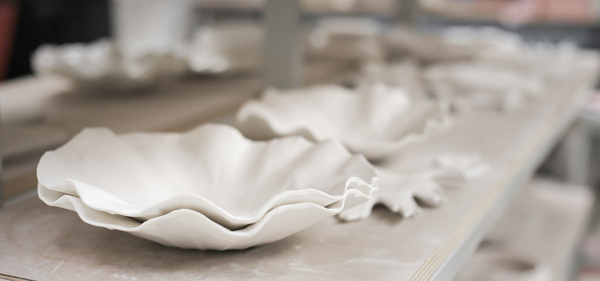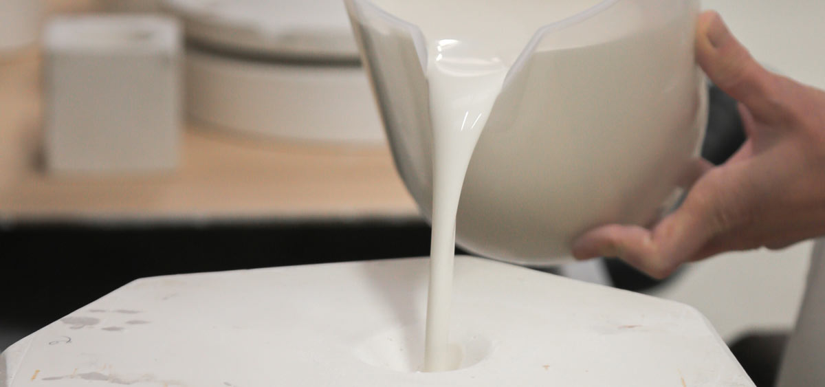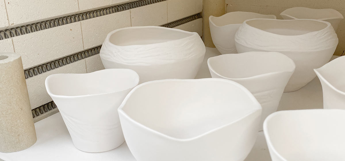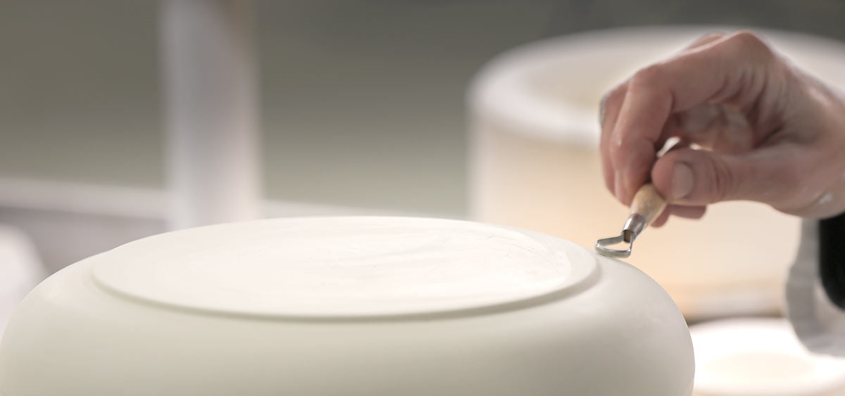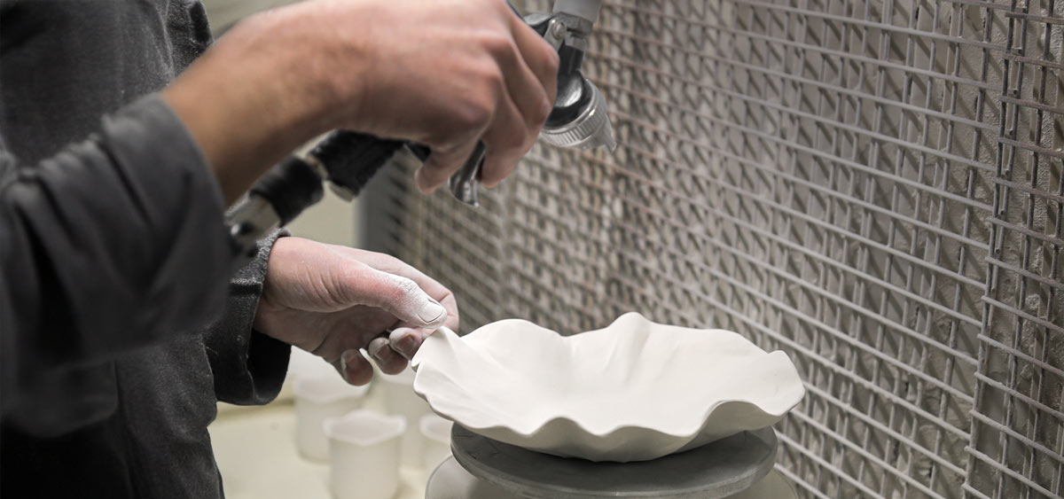 de nos clients et essayons de répondre à leurs envies et besoins, tout en préservant et en magnifiant l’identité si particulière de notre porcelaine. Une première étape est la conception des modèles par notre associé Dominique, potier-céramiste fort de 40 années d’expérience. Ces modèles sont réalisés en plâtre, argile ou grès et doivent intégrer le retrait et la déformation finale des pièces