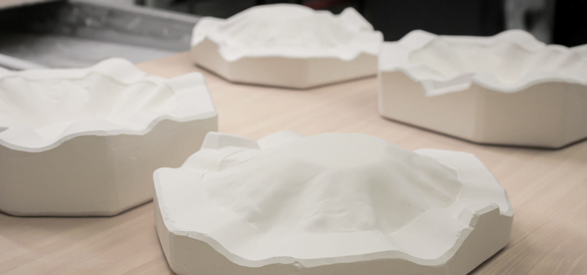 Nos moules sont réalisés en plâtre par notre équipe et par notre partenaire porcelainier, Jean-Louis PUIVIF. Ils serviront à produire nos pièces en série. Un premier moule mère positif est fabriqué, duquel nous pouvons recréer des moules négatifs de production. Un moule est conçu pour réaliser une soixantaine de tirages, au-delà, il faut le remplacer.